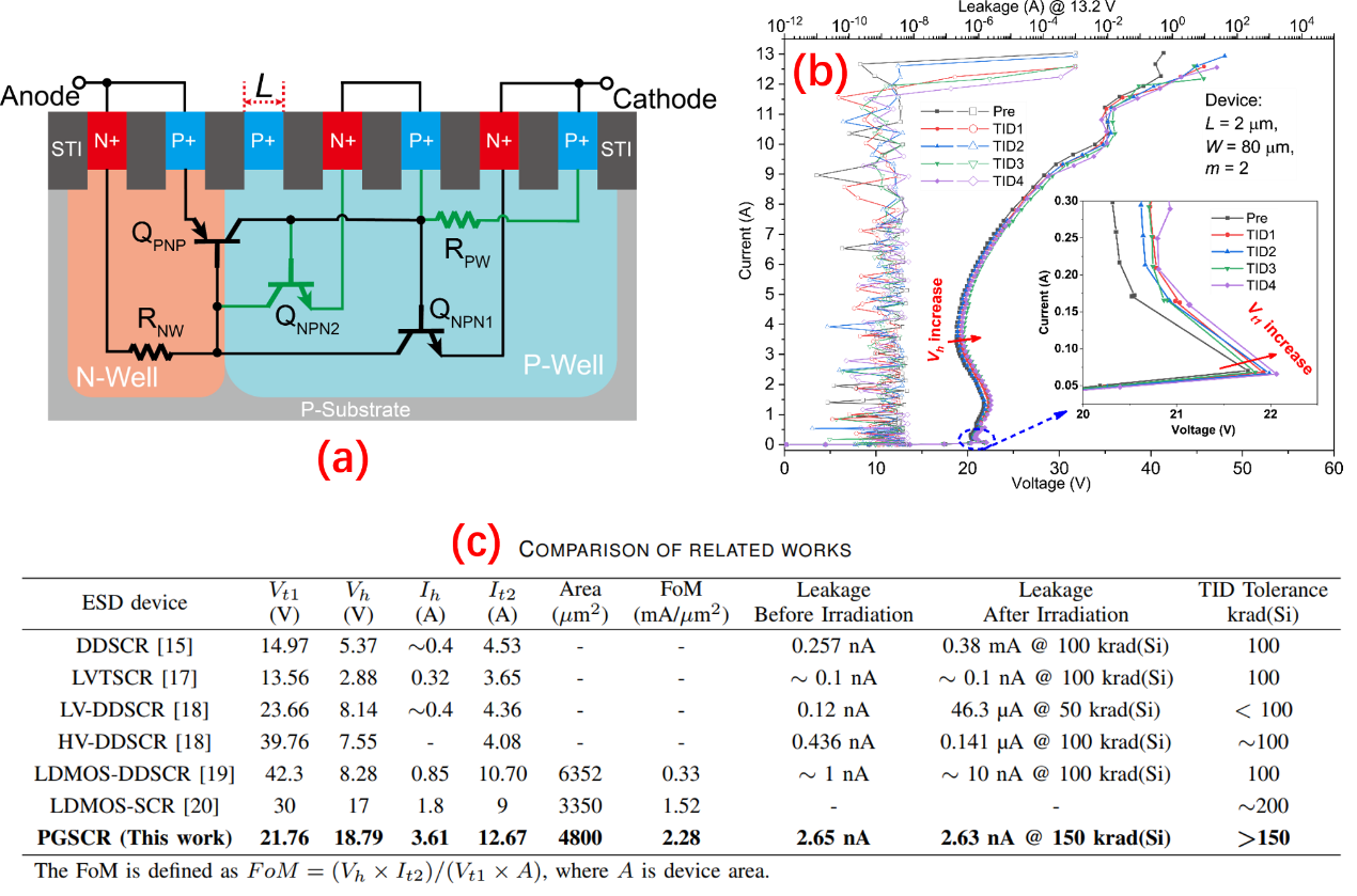 图(a)是所设计的静电释放(ESD)保护器件PGSCR的结构剖面图,得益于并联QNPN2管对QPNP和QNPN1管构成的主要可控硅(SCR)静电释放路径的分流作用,该器件具有较高的维持电压,可以避免高电压电路正常工作时ESD路径的闩锁风险。图(b)是辐照前及不同总剂量辐照后(最高辐照总剂量达150 krad(Si))器件的传输线脉冲(TLP)测试结果,TLP测试结果表明辐照后器件的失效电流没有退化,其泄漏电流始终维持在纳安量级,这个结果优于已发表的ESD器件,这表明PGSCR器件具有极强的总剂量辐射耐受性。图(c)为本工作提出PGSCR器件与行业同类型ESD保护器件在关键参数方面的对比:PGSCR器件具有高维持电压和维持电流,器件的整体优值也优于其他同类器件,该器件可以在高达150 krad(Si)的总剂量辐照后维持相同的失效电流和泄漏电流。