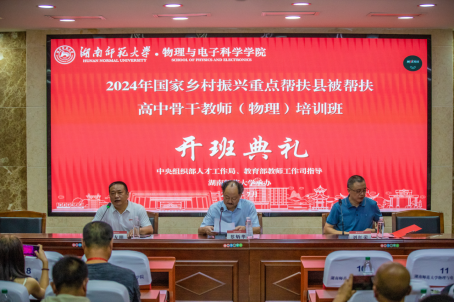 (通讯员:刘鹏、马前春)7月26日上午8:30分,在中央组织部人才工作局、教育部教师工作司的统一组织与指导下,由湖南师范大学承办、基础教育教师发展中心和物理与电子科学学院具体实施的“2024年国家乡村振兴重点帮扶县被帮扶高中骨干教师(物理)培训班”的开班典礼活动在格物楼举行。湖南师范大学物理与电子科学学院院长刘红荣教授、湖南师范大学基础教育教师发展中心主任蔡炳华、湖南师范大学物理与电子科学学院副院长李友明以及来自云南、广西、贵州、内蒙等十个省(区、市)146名学员出席了开班典礼,仪式由李友明副院长主持。