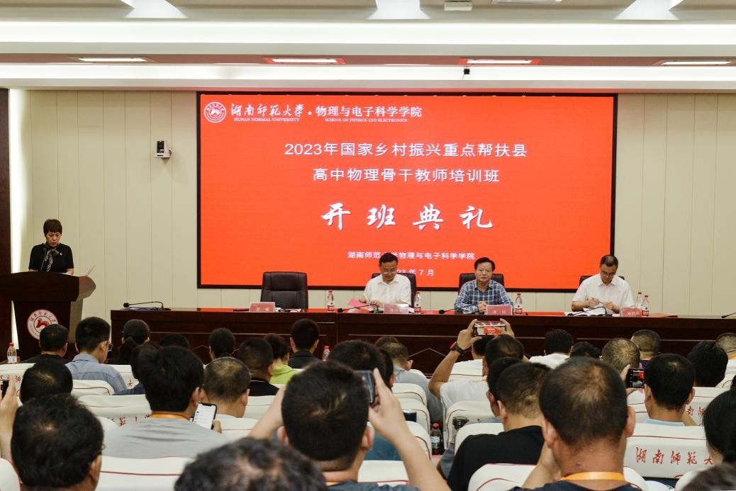 (通讯员 罗瑞霞 马前春)麓山传星火,湘江闻佳音。7月23日,2023年国家乡村振兴重点帮扶县教育人才“组团式”帮扶项目湖南师大高中物理教师培训班举行开班仪式。湖南师范大学副校长刘怀德,基础教育中心办公室主任龚民,物理与电子科学学院院长刘红荣出席会议,物理与电子科学学院党委书记罗嵘主持会议。
