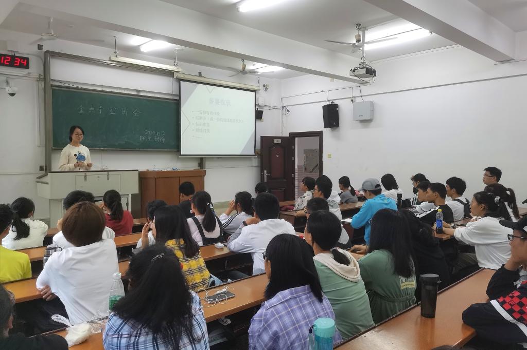 肖雨桐向同学们介绍了“金点子”大学生创新大赛的基本内容和举办意义。她从作品组别、参赛要求等方面详细介绍了“金点子”创新创业大赛的特点与申报条件,并介绍了大赛的前期准备,让同学们对大赛有了很直观的了解。希望同学们在参与实践的过程中找到正确的创新方向和动力,鼓励同学们积极的深入了解有关“金点子”大赛的优秀参赛作品和比赛机制,积极参加“金点子”创新大赛。