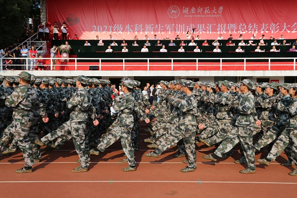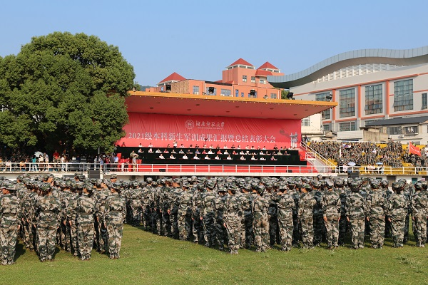 (通讯员陈星羽 陶惠茹 刘毅)10月3日上午,湖南师范大学2021级本科新生军训成果汇报暨总结表彰大会在校本部田径场举行。