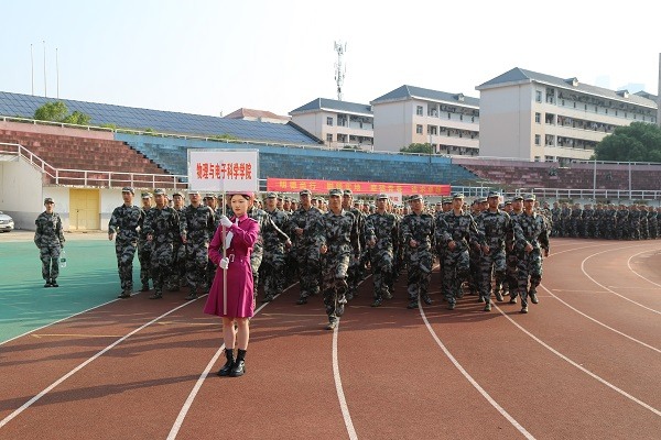 在庄严的升旗仪式后,军训成果汇报正式开始。伴随着分列式进行曲的鼓点,各队列方阵踏着正步,高喊口号,顺次从主席台前通过。物理与电子科学学院的方阵中,新生们昂首挺胸,迈着整齐划一的步伐。“物电物电,活力无限,探物穷理,勇往直前”,嘹亮的口号蕴含着物电学子扎实的作风。