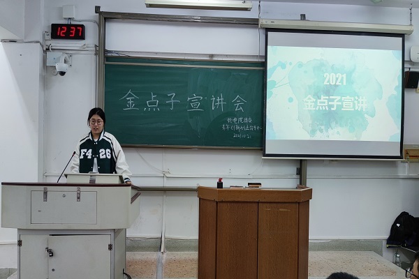 主讲人曹秋语向同学们介绍了“金点子”大赛的基本内容、注意事项和举办意义,从作品组别、参赛要求和比赛流程等方面说明此次大赛的特点。她希望同学们在参与实践的过程中提高综合实力,找到正确的创新方向,并鼓励大家积极了解并参与相关比赛。