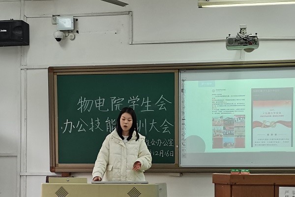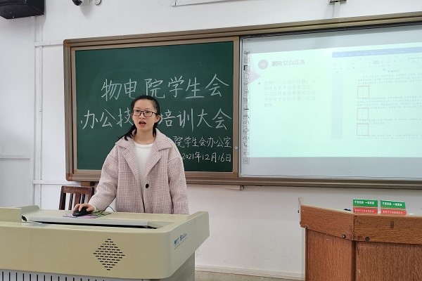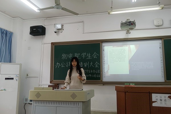 (通讯员 朱紫暄 郭佳艺 陈星羽)为了提升学生会各部门工作人员的综合素养,物理与电子科学学院学生会于12月16日中午在格物楼216教室开展办公技能培训会。院学生会办公室负责人朱紫暄、办公室副部长郭佳艺和宣传部负责人黄红霞担任主讲人。