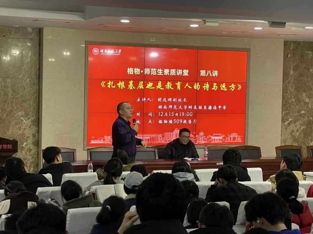 (通讯员许佳棋)12月15日晚,物理与电子科学学院在格物楼509报告厅举行格物·师范生素质讲堂第八讲,我院校友湖南师范大学附属桂东濂溪中学副校长胡远辉老师担任主讲,讲座由院党委郭铭伟副书记主持。