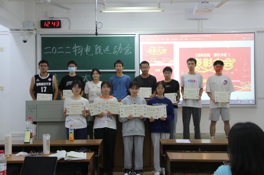 主持人以图片的形式回顾了物电院的运动员们在此次校运会上的精彩瞬间。这些精彩瞬间展现了运动员们坚持不懈、顽强拼搏的精神。最后,工作人员依次给获奖运动员颁发了个人项目奖、接力项目奖、优秀运动员奖、趣味项目奖等奖项。