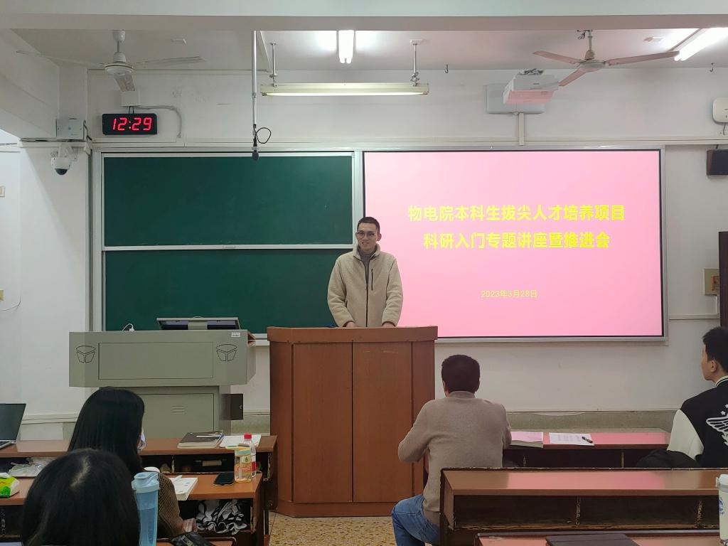 (通讯员 颜明伟)3月28日中午,物理与电子科学学院在格物楼220教室举行2022年物电院本科生拔尖人才培养项目科研入门专题讲座暨推进会。物电院物理系副系主任任昌亮教授,学工办主任黄维老师出席此次会议。