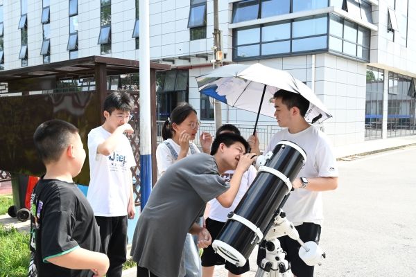 (通讯员 段楚楚 袁俊 涂月华)“太阳为什么会有小黑点?” “小黑点是什么?”“太阳黑子是太阳被星星遮住了吗?”“为什么两架望远镜看到的太阳颜色不同?”……7月15日上午,来自湖南师范大学物理与电子科学学院阳光教育协会的“灿箬百星“队伍于湖南省湘江新区白箬镇白箬中学开展天文观测与讲解系列活动。此次活动以“太阳黑子”为主题,湖南师范大学天文馆协助开展此次活动,来自湖南师范大学物理与电子科学学院天文协会理事会的王淇鑫、熊哲、罗俊,袁俊担任讲解员。