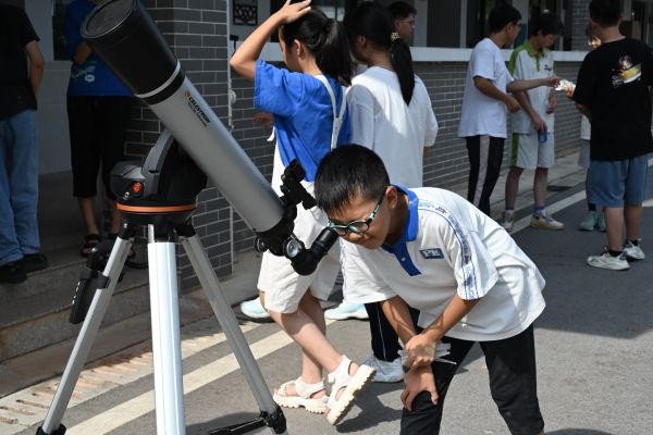操场上,支教队将组装好的天文望远镜对准太阳,进行多次调试,确定在望远镜上可以观测到清晰的太阳黑子后,为孩子们讲解远镜的正确使用方法,开始组织孩子们进行观测。孩子们严格遵守秩序,在讲解员的辅导下,依次进行观测,并发挥想象力去思考“太阳黑子是什么?”“为什么会出现太阳黑子?”。孩子们的大胆猜测与积极思考得到了讲解员们的充分肯定,增强了他们学习天文知识的荣誉感和使命感,营造了积极的活动氛围。