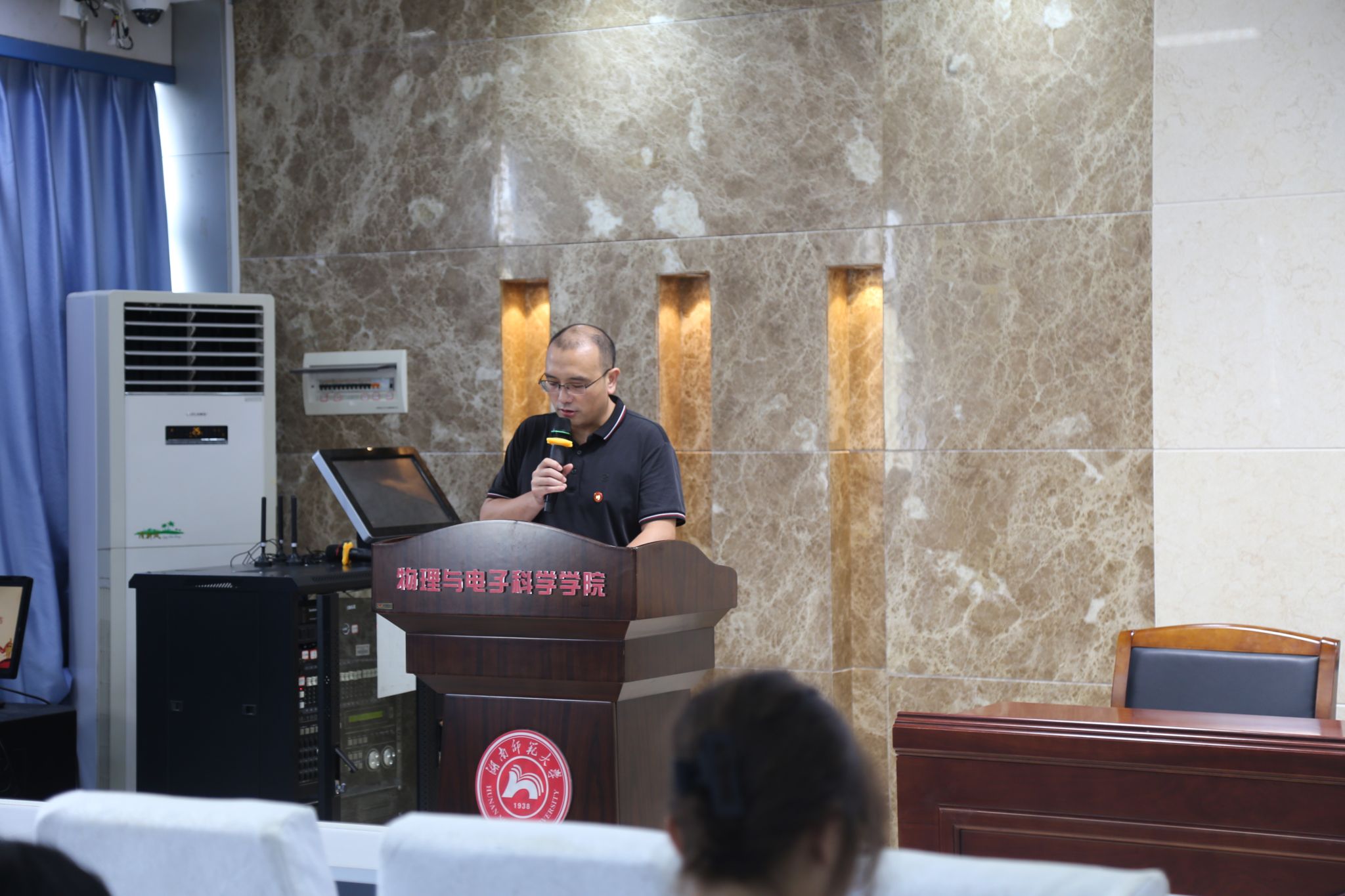 (通讯员 王贻菲)9月8日中午,物理与电子科学学院于格物楼509教室举行第二十二次共青团员、学生代表大会。校团委书记陈天嵩、院党委书记罗嵘、党委副书记郭铭伟、学生工作办公室全体辅导员出席会议,2023级辅导员滕茂主持会议。共青团员、学生代表共180余人参加此次会议。