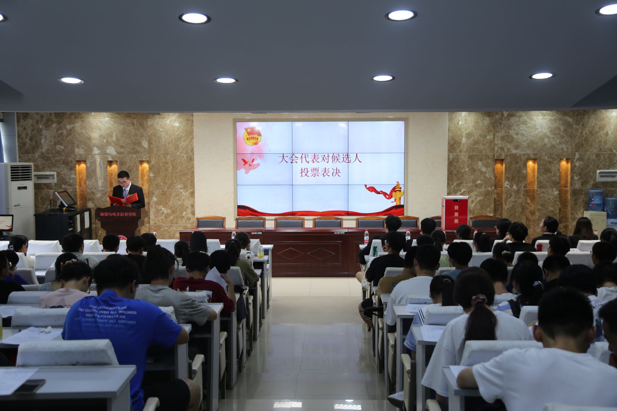 正式会议开始前,2022级本科生周志豪主持召开了预备会议。滕茂宣读2022-2023年度物理与电子科学学院主要学生委员的选举章程和计票方式。在了解了候选人的基本资料和竞选宣言后,在场代表们有序填写了选票,并交由工作人员计数。