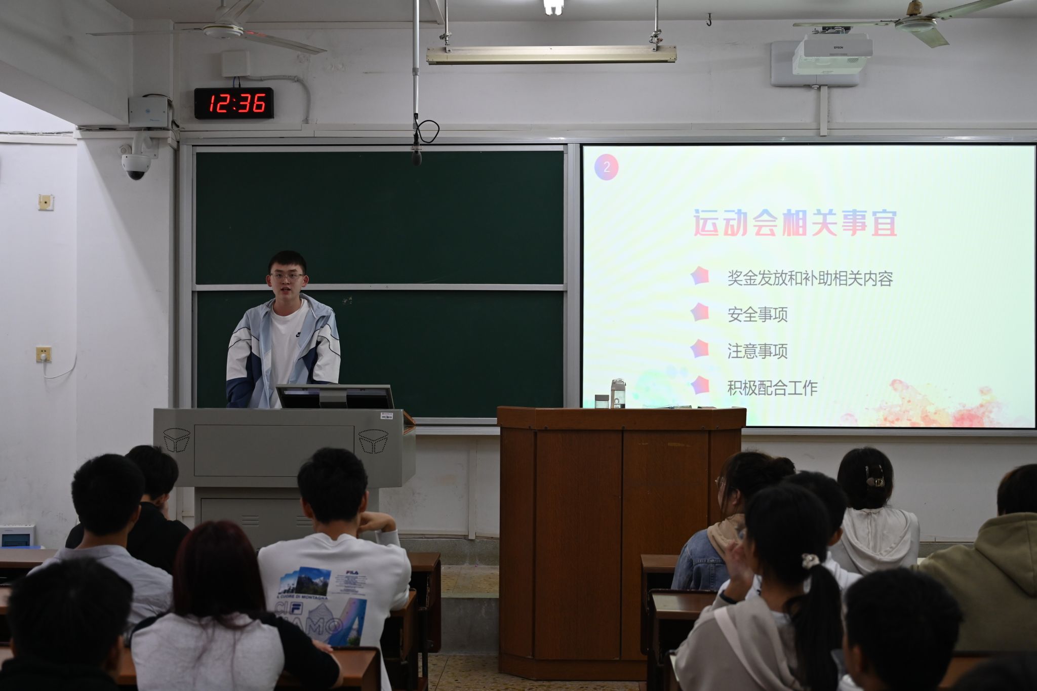 文体部干事廖煦平向参会运动员们介绍了运动会相关事宜及运动会的奖金与补助发放等奖励机制。运动员代表罗杰向运动员们分享过往比赛体验。他认为校运会是物电院学子体现坚强意志的机会,希望运动员们能从运动中感受快乐、勇往直前,为学院争得荣誉。