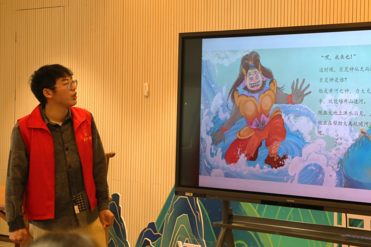 为激发小朋友们的思维活跃性,营造融洽的氛围,故事开讲前,黄睿先同小朋友们进行了“看图猜成语”的小游戏,小朋友们纷纷积极地举手抢答。通过PPT放映的方式,他向小朋友们展示了华山上与故事相关的景点,将小朋友们引入故事情节中。他用生动活泼的语言向小朋友们分享了《巨灵劈山》的故事,故事中,巨灵神不畏艰险,用尽全力劈开山以疏导洪水,拯救百姓于危难之中。在志愿者们的指导下,小朋友们画出巨灵山分开两座大山的情形,加深了对故事的印象。