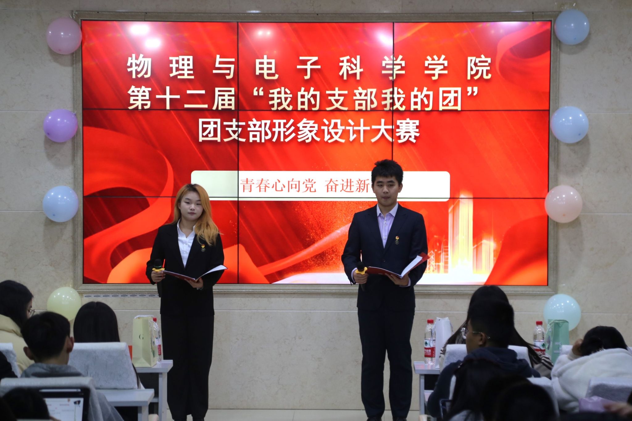 (通讯员 康胜 罗荔彤 段楚楚)11月17日晚,物理与电子科学学院于格物楼509报告厅举行第十二届“青春心向党,奋进新征程”主题活动之“我的支部我的团”团支部形象设计大赛。院学工办全体辅导员出席活动。2022级谭文珍、2023级李长春担任主持人。