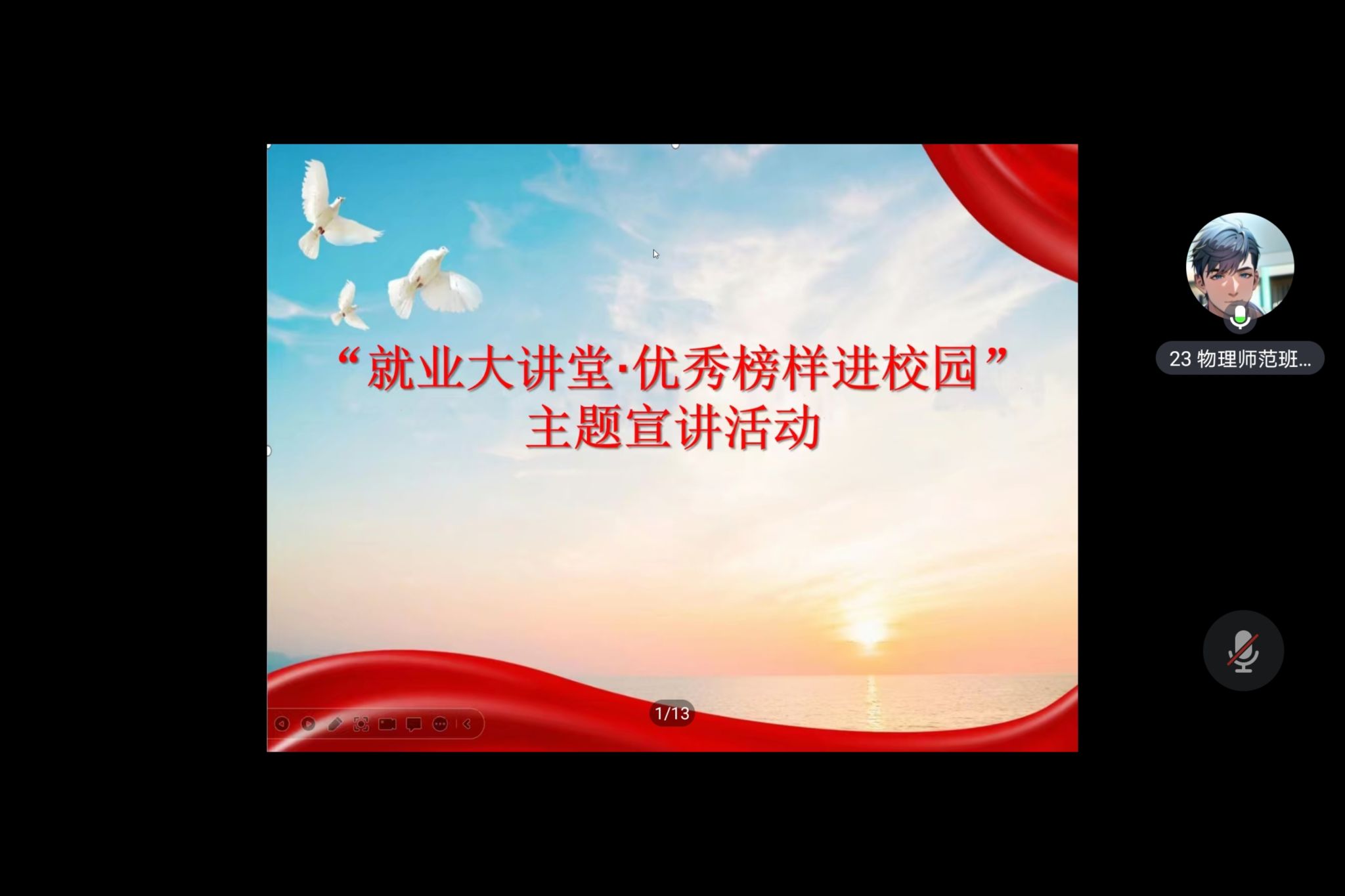 (通讯员 王贻菲)为引导同学们树立正确的就业观与择业观,用实际行动去拥抱自己的美好未来,11月17日晚,物理与电子科学学院(以下简称“物电院”)团委区校共建部于线上举办“大学生就业引航活动季”活动。物电院2020级本科生颜明伟担任主讲人,2022级、2023级部分学生参加会议。