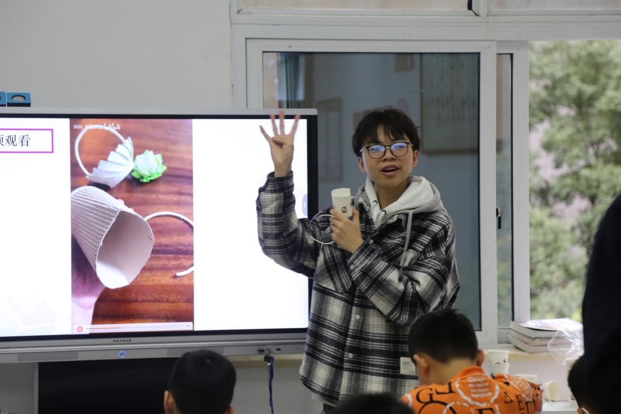 课堂上,梁翔为小朋友们介绍了霉菌的相关知识,推荐了绘本《霉菌姑娘——关于腐烂变质的真相》,激发小朋友们的求知欲。为进一步提高小朋友们的兴趣,他采用视频形式依次展示了纸片托水、非牛顿流体、手工制纸杯花篮实验并使用简洁易懂的语言辅助讲解,便于小朋友们理解原理与流程。志愿者引导小朋友进行淀粉浆制取、修剪纸杯等操作,小朋友们在过程中既提高了参与感,动手能力也得到了充分锻炼。