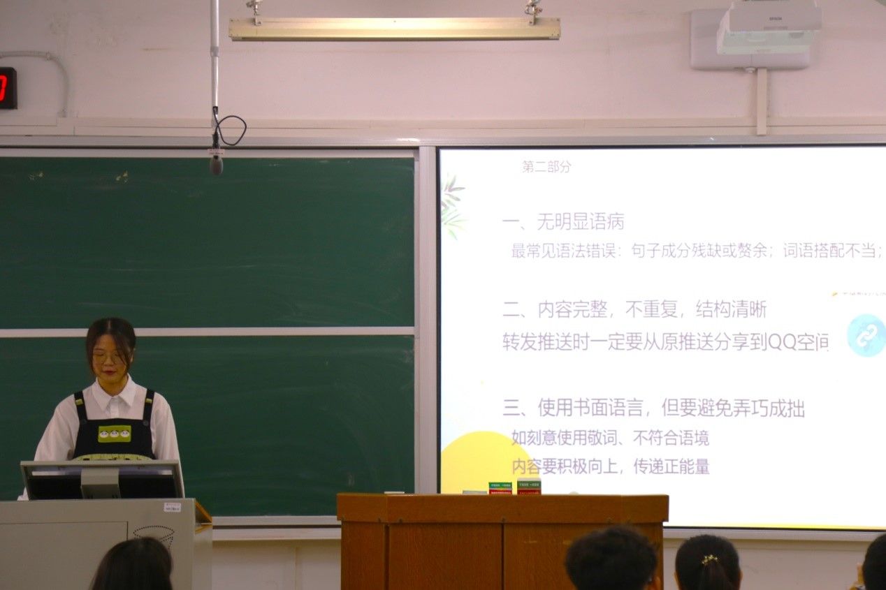 “宣传推送小技巧”板块培训中,何亚亚从推送内容、书面语言的使用、链接格式三个板块进行宣传推送工作的培训。考虑到推送的受众人群,她认为推送内容应正面积极,符合社会主义核心价值观。在不偏离主题的前提下,推送文案的语言风格应依据题材而改变,推送中所使用的图片也需突出主体、切合主题。她提醒宣传部干事发布宣传推送时,需确保推文无错字、无语病并确保推文链接格式正确。