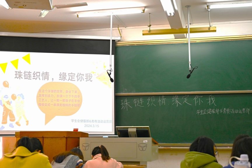 3月15日中午,“珠链织情,缘定你我”活动于格物楼123教室开展。在活动过程中,同学们依次排队领取制作手链的材料及工具,发挥创造力,让一颗一颗珠子在手中变成一串漂亮独特的手链。通过专心编织手链,同学们的压力得以释放,身心得到放松,动手能力得到提升。同时在格物楼124教室进行的“走进女书”活动通过女书文化介绍、知识问答和书法比赛三个环节弘扬源远流长的女书文化,鼓励同学们走进女书,学习古人智慧。