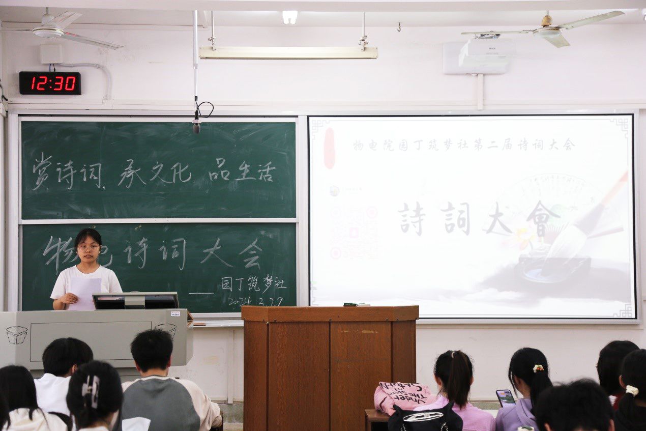 (通讯员 陈泽瑞 王贻菲)为响应国家传承中华优秀传统文化的要求,培养德智体美劳全面发展的教育人才,提升教育者气质。物理与电子科学学院园丁筑梦社于格物楼220举办”诗意人生,美好未来“诗词大会活动。2023级本科生李雅担任主持人。园丁筑梦社66名会员参加。
