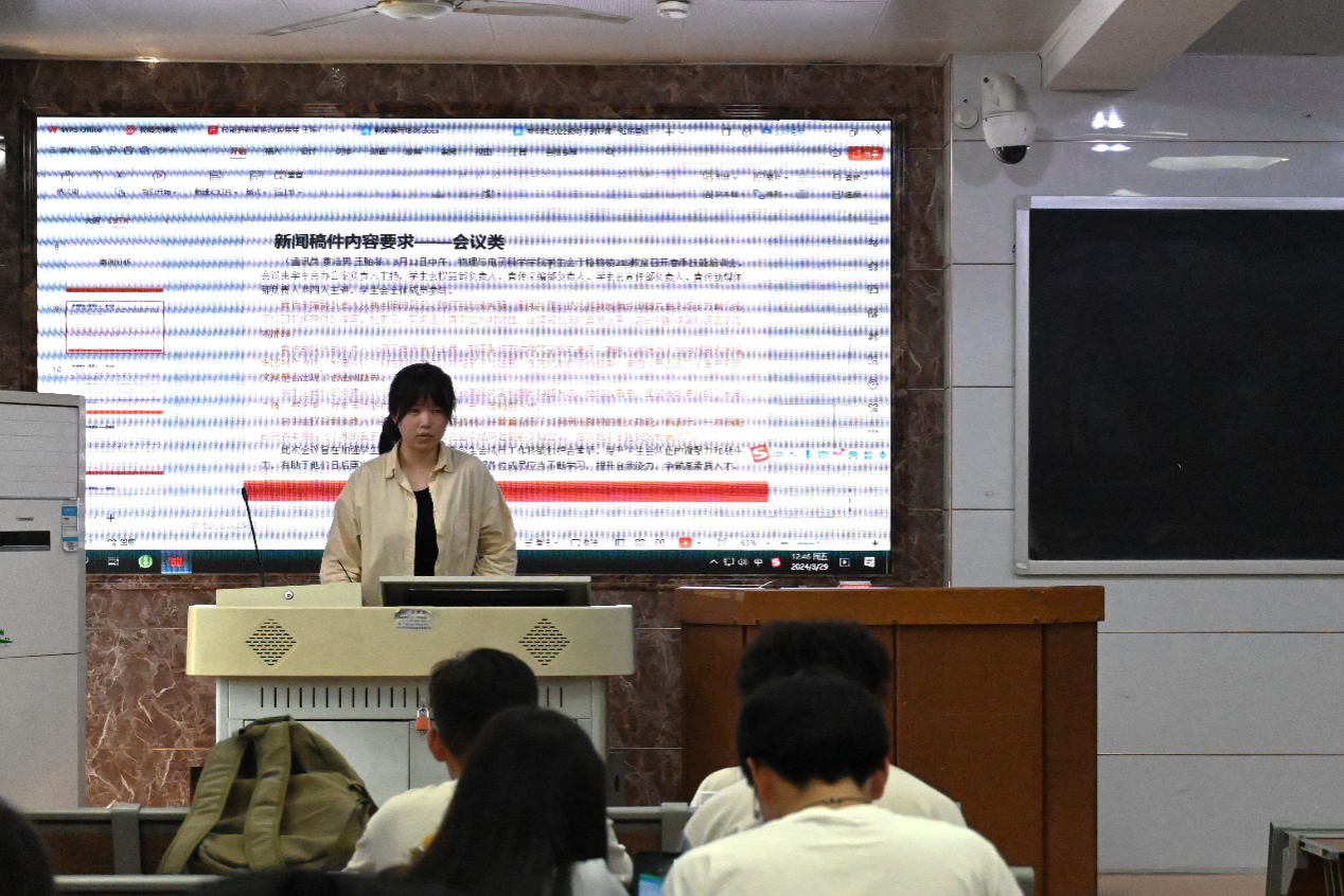 段楚楚从新闻标题和新闻内容两部分向学员们介绍了新闻的格式要求。她强调了新闻标题对概括性的要求,并从照片、导语、正文和结尾四个方面介绍了新闻内容的要求:新闻照片应当清晰,并附上对应的图片说明;导语部分需要写明通讯员和事件的原因、时间、人物等信息;新闻正文要求用简洁通顺的语言写清楚新闻事件的内容;新闻结尾则多以阐述活动的意义作为结尾。