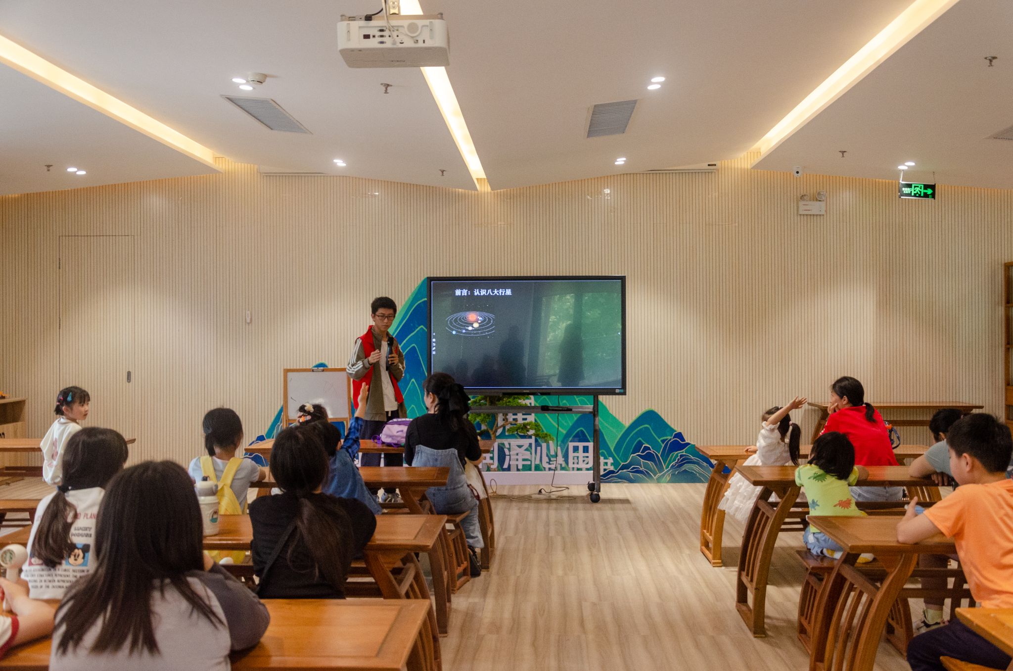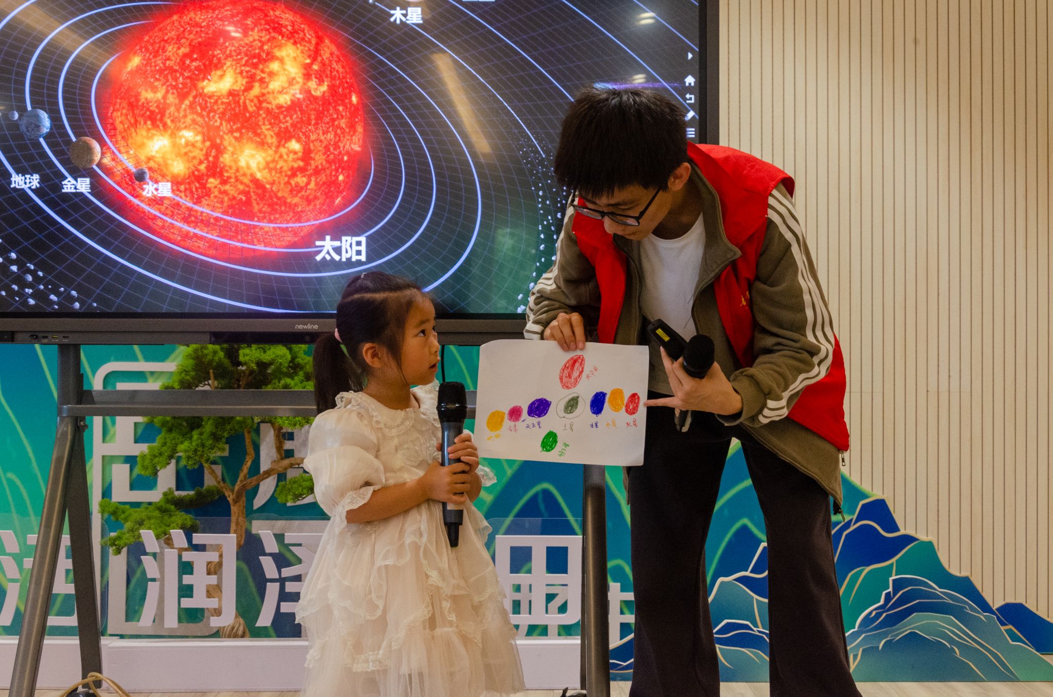 此次课堂的主题是“走近八大行星”。闫岱辰以其丰富的天文知识和生动的讲解方式,深入浅出地介绍了太阳系的八大行星。他详细讲解了每个行星的特征,如水星的快速自转、金星的浓厚云层、地球的丰富水资源、火星的火山和峡谷、木星的巨大红斑、土星的环、天王星的倾斜轨道和海王星的强风。通过闫岱辰的精彩讲解,孩子们对天文知识有了更深一步的理解。同时,在志愿者们的引导与鼓励下,孩子们发挥出自己的想象力,将自身创意与对宇宙的好奇融入作品中,画出了自己心中独具一格的行星。