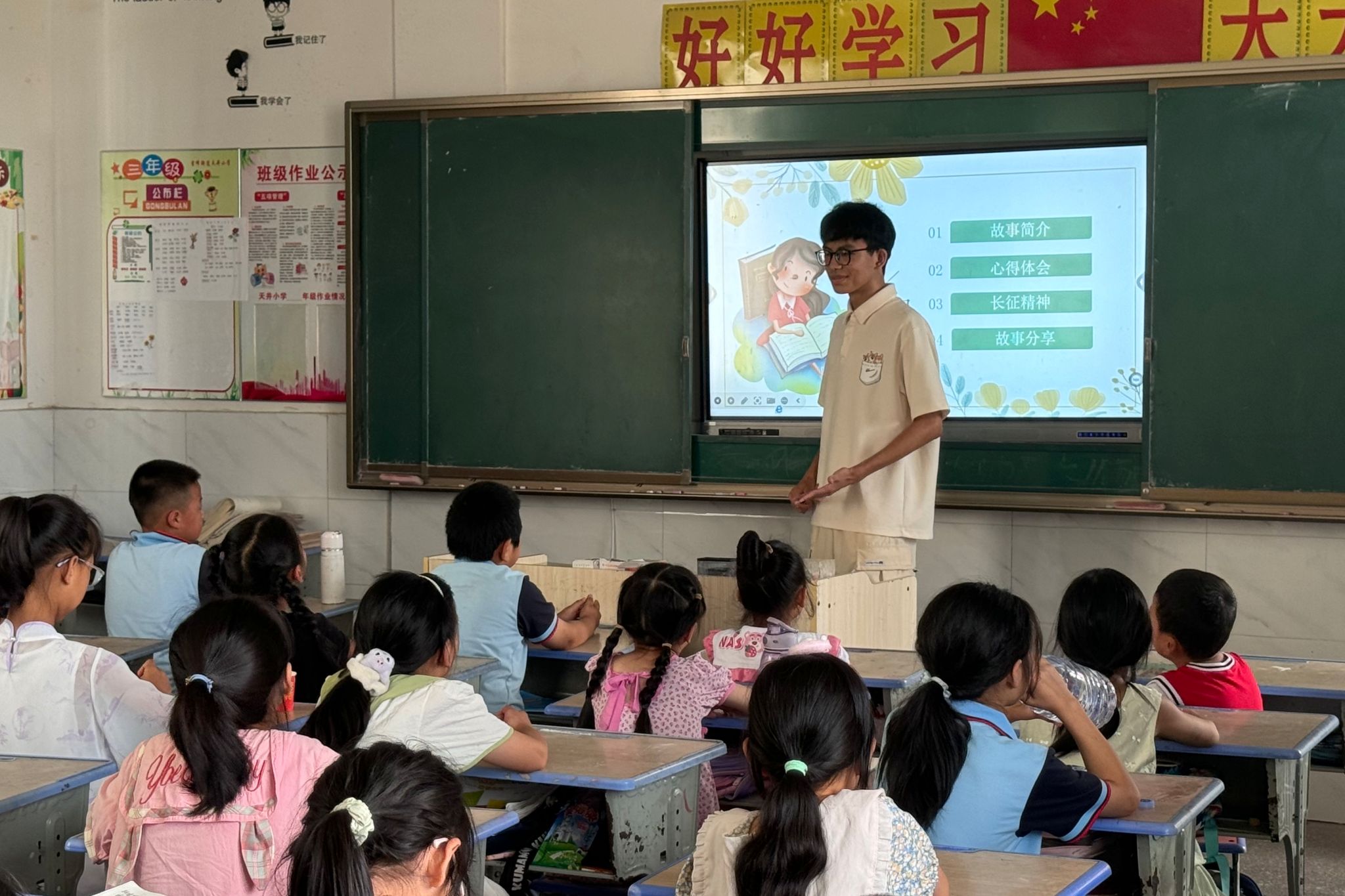 向世明从红军长征故事出发,同时结合洞口县与长征有关的当地故事,向同学们讲述长征精神的丰富内涵。在介绍当地可敬的革命先烈王康元的事迹时,他告诉学生们在面对困难时要保持积极乐观的心态,弘扬排除万难、不怕吃苦的长征精神。他还教导同学们要养成红军勤俭节约、团结协作的美德,并将其应用于生活中各个方面。