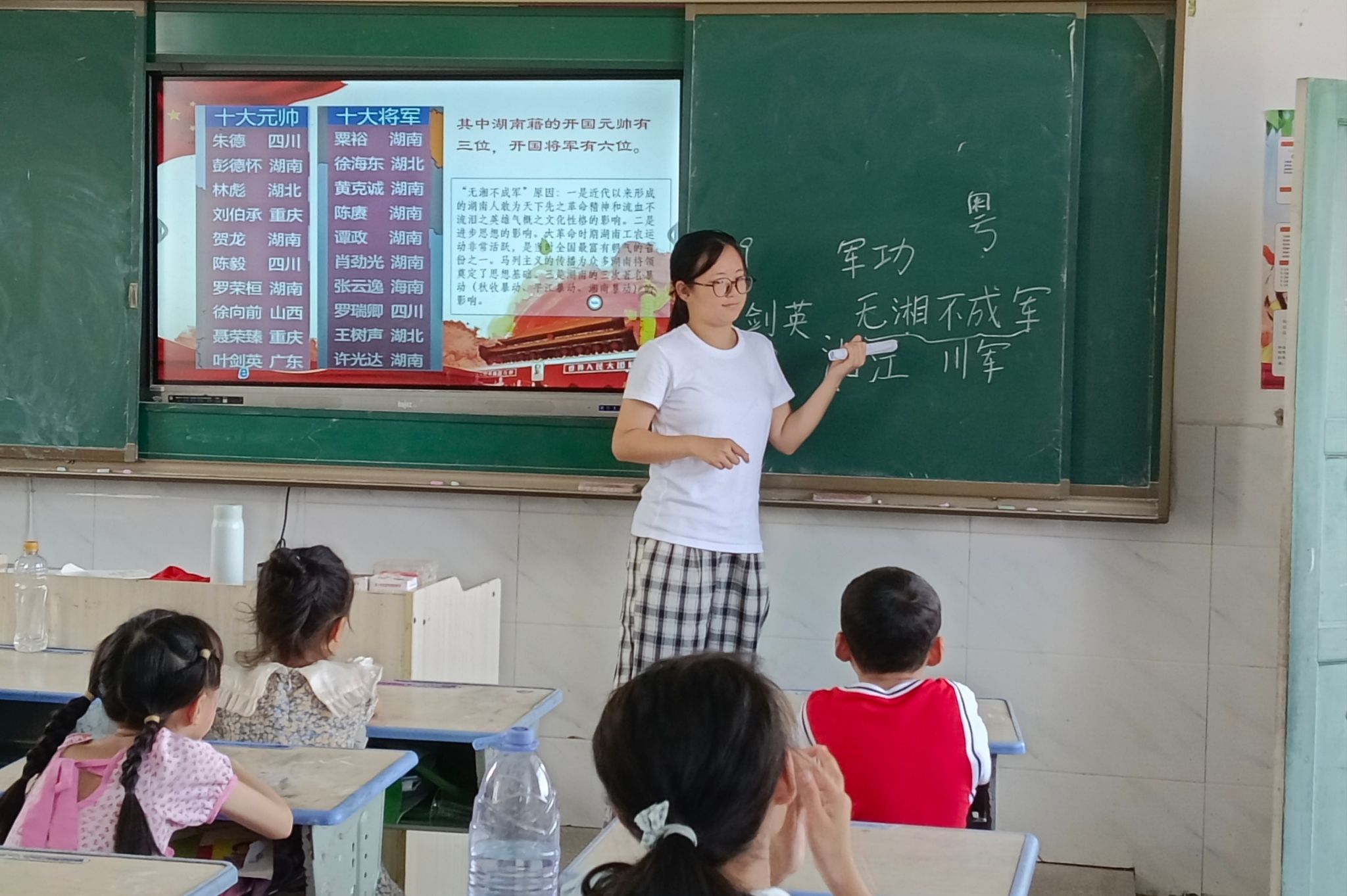 易佳与学生们齐声高唱国歌,渲染出激情澎湃的课堂氛围。紧接着,她用三位湖南籍开国元帅彭德怀、贺龙及罗荣恒的故事引入,为学生们讲述了湖南人在革命事业中做出的伟大贡献,并解释了“无湘军不成军”的原因。她悉心教导学生们学习三位开国元帅敢为天下先的革命精神,以培养学生们的爱国情怀。
