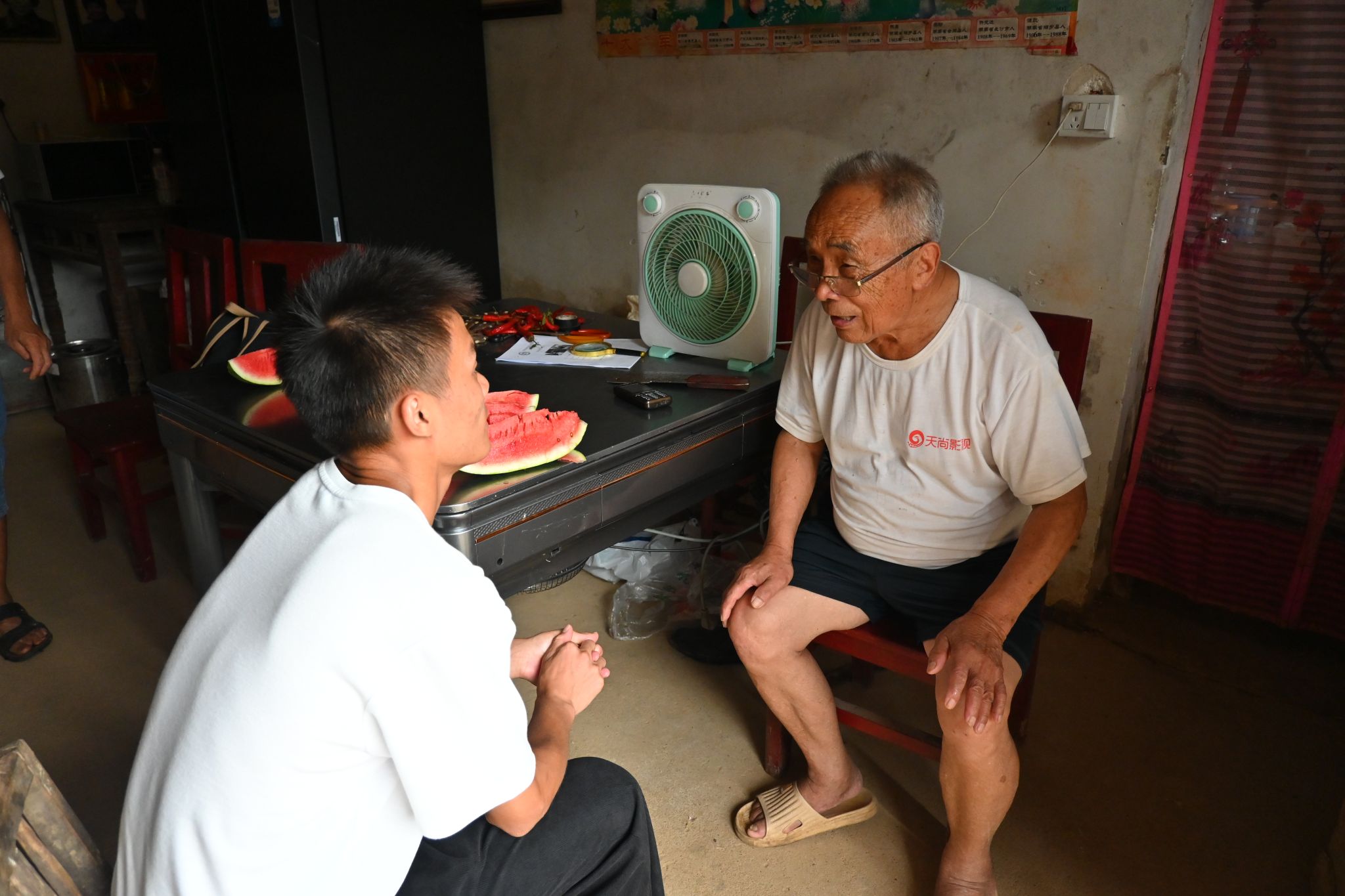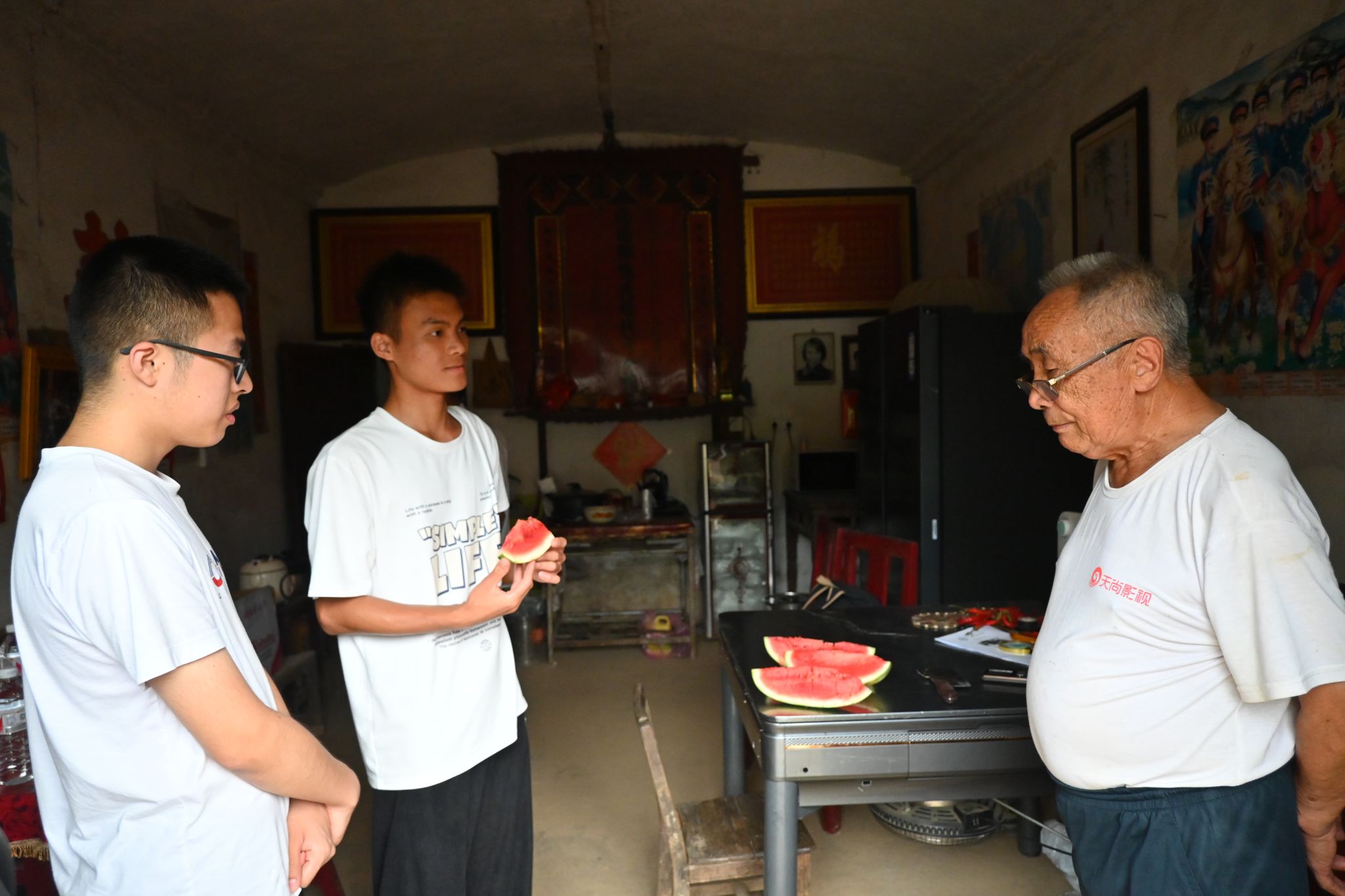 邓联珊,现年90岁,曾在中国人民志愿军中担任通信兵,复员后回到湖南,现独居于邵阳市洞口县炉子村。邓联珊生活简朴,未精心装潢的房屋内挂着“开国十大将军”和“开国十大元帅”等海报,象征着老人对革命的忠诚。志愿服务队成员认真聆听邓联珊叙说军旅岁月和退伍后的生活,成员们从讲话中体会老人对祖国的热爱,感受时代的发展。介绍完自己后,邓联珊与到访的成员们密切交流,老人感叹道,中国的发展离不开青年人的奋斗,离不开科学的进步,他鼓励成员们努力学习,用科学知识为国家作出贡献。