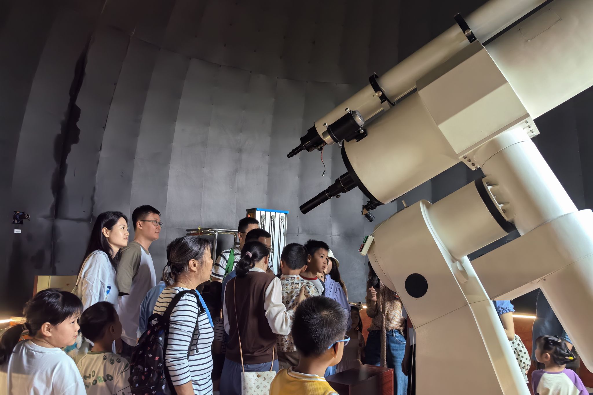 讲解员以图文结合的方式,阐述了二十四节气的由来以及中国古代流行的三种关于天地结构的学说。在谈到恒星的一生时,讲解员一边带领小朋友们参观馆内的恒星模型,一边引导他们入座并观看天文视频,进一步增加小朋友们对恒星的了解。此外,讲解员通过演示傅科摆设备,向小朋友们介绍了如何利用傅科摆证明地球的自转,并用通俗易懂的语言向小朋友们科普了热大爆炸宇宙学理论。讲解员耐心指导小朋友们使用望远镜进行观测,并带领他们参观了顶层的折返式天文望远镜。
