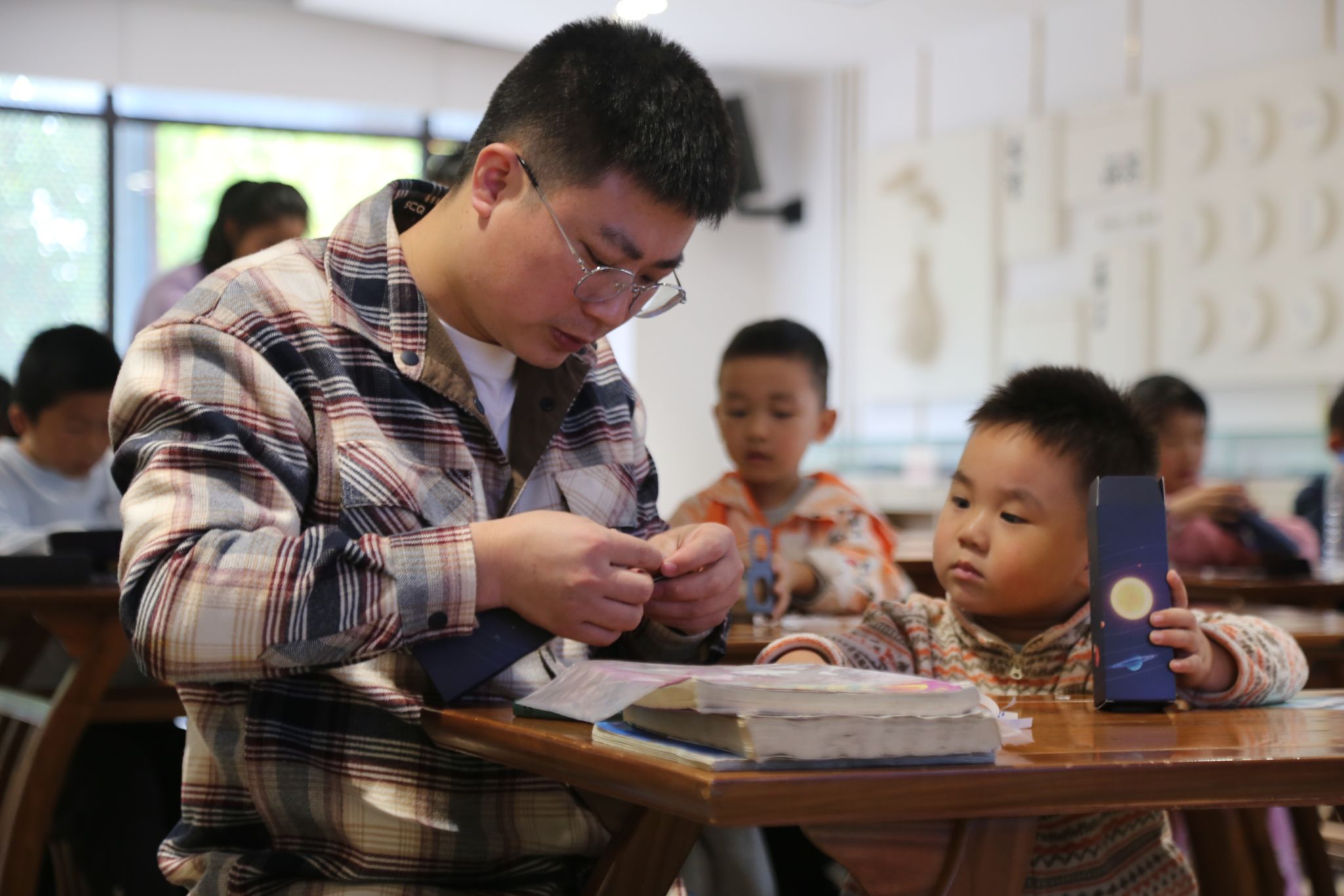 在读书会开始前,参与活动的小朋友有序入场并就座,现场志愿者协助引导,为活动顺利开展提供了支持。活动中,主讲人通过展示绚丽的星空图像,启发小朋友们思考流星的形成原理,随后用生动易懂的语言讲解了相关天文知识。在讲解过程中,辅以插画与视频材料,帮助参与者增强对流星现象的理解,并拓展了天文观测方面的基础知识。现场小朋友积极参与互动并回答问题,主讲人则对提问作出解答并给予鼓励。在随后的手工环节中,志愿者组织亲子家庭共同制作望远镜,并耐心指导大家完成手工作品。