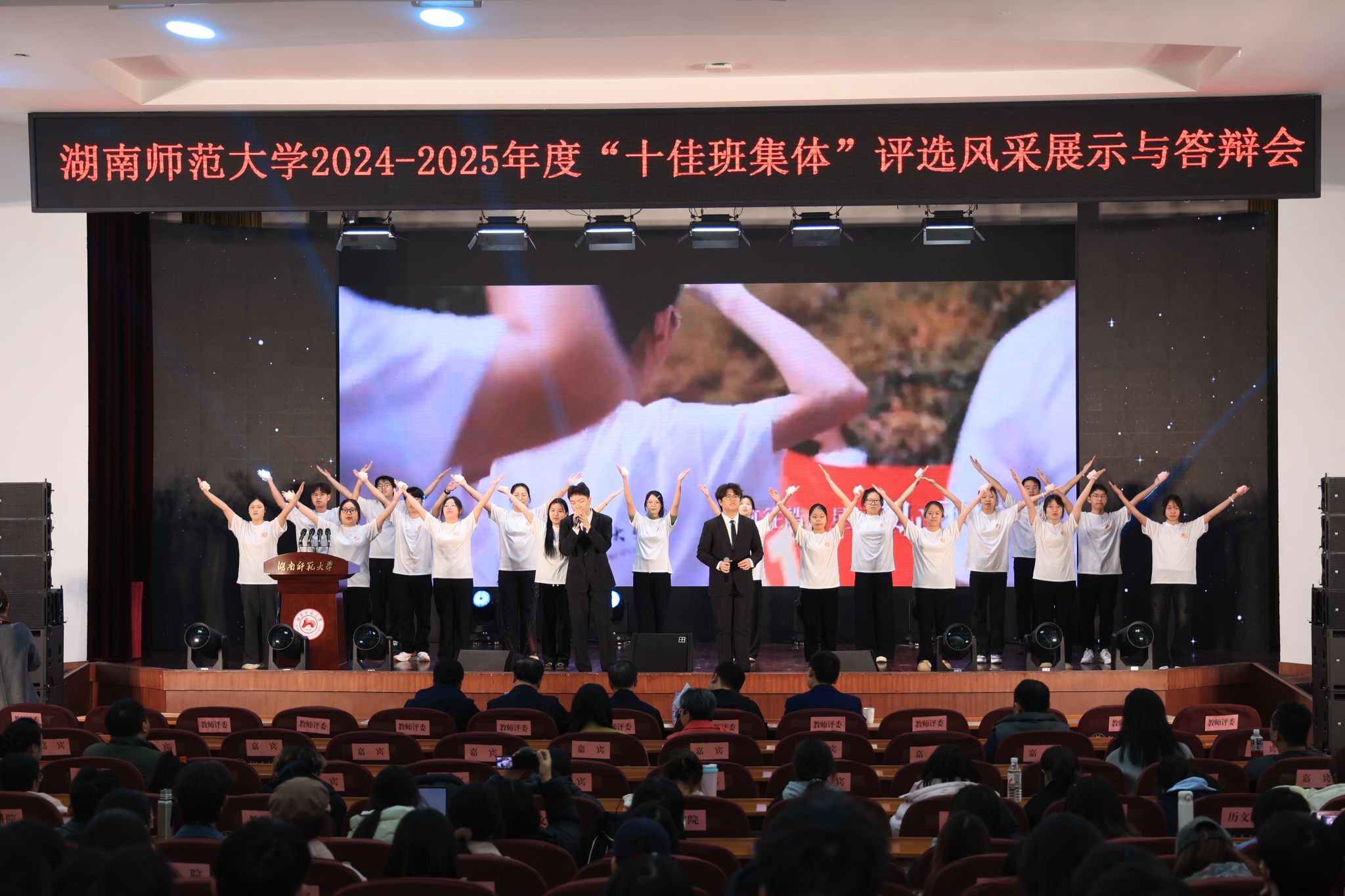 (通讯员 高旭琴 滕茂)12月18日晚,湖南师范大学于国际学术报告厅举办“十佳班集体”评选风采展示与答辩会。物理与电子科学学院党委副书记郑智、2023级辅导员滕茂亲临现场,与学院2023级物理学3班全体参赛成员共同参与风采展示。作为学院推荐班级,物理学3班以详实成果与精彩答辩斩获佳绩,获评湖南师范大学2024-2025学年度“先进班集体”,展现新时代师大学子风采。