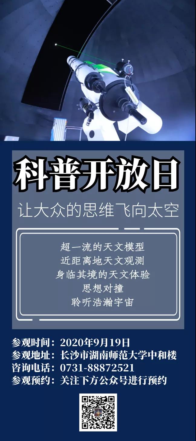 为了响应湖南省科学技术协会关于科普活动的系列开展,为了更好地践行湖南师范大学天文馆作为省级科普基地的社会职能,湖南师范大学天文馆于2020年9月19日(上午9点-12点),免费向公众预约开放。