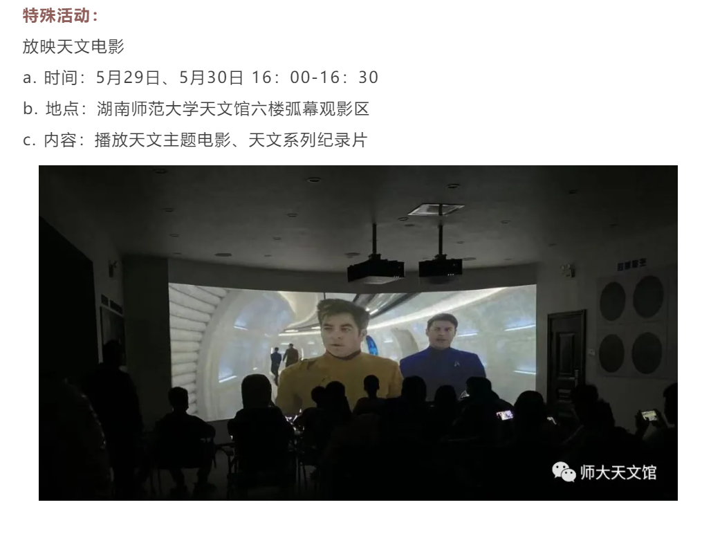为实现师大天文馆普及天文知识、传播科学精神的职能,进一步促进天文馆工作向前发展,湖南师范大学天文馆将于五月的最后一周举行天文馆科普开放周活动,具体事宜通知如下: