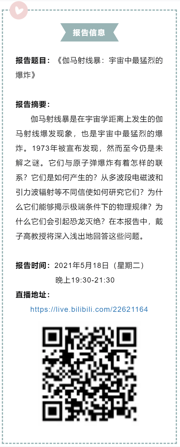 5月18日晚上19:30,戴子高教授将在我院(物理与电子科学学院)格物楼509报告厅带来一堂讲座—《伽玛射线暴:宇宙中最猛烈的爆炸》。届时,师大天文馆将在B站进行同步直播。