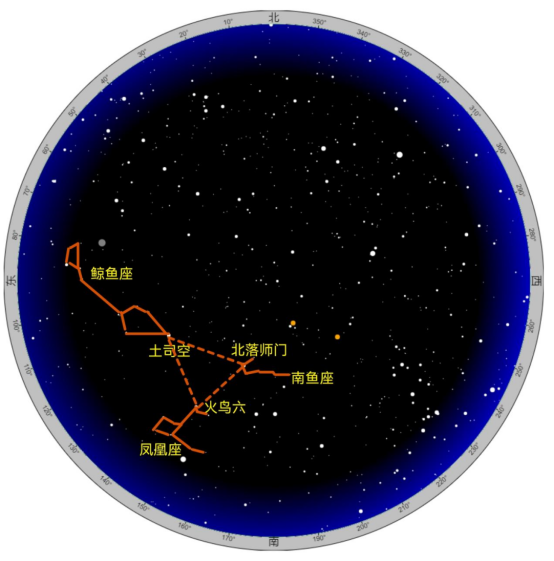 将北落师门、土司空、火鸟六这三颗星连成一个三角形,就形成秋季南方星空较为明显的标志--秋季南天三角形。组成秋季大三角的这三颗星都是它们所在星座中最亮的星。