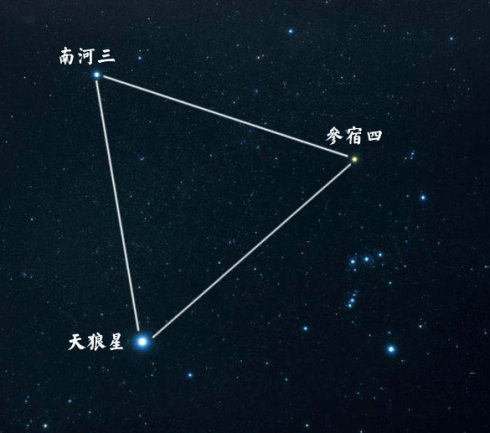 目光再回到猎户座三星,当我们把视线往西方望去,我们可以找到同属于猎户的参宿四,再向东方找到明亮的南河三,与之前提到的天狼星一起,这三颗星星构成了著名的冬季大三角。