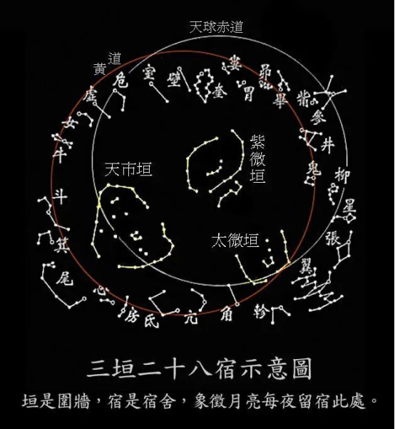 中国古人除了在黄道附近划分了二十八个星区,还将北半球所能看到的其他星区划分为三个区域,即三垣(yuan),分别为紫薇垣、太微垣和天市垣。紫薇垣为天上君王的住所,其屋檐中心就是北极星。