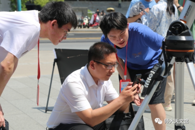 (通讯员 段楚楚)4月17日中午,物电院天文协会于五舍广场举办志愿行活动——观测太阳黑子。21级辅导员韩翔宇参与此次活动,天文协会各理事担任志愿讲解员。