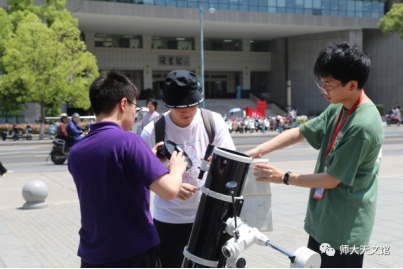 在五舍广场前,天文协会的志愿者们将组装好的天文望远镜对准太阳,进行多次调试,确定在望远镜上可观测到清晰的太阳黑子后,志愿讲解员们开始邀请路人进行观测。精密的仪器与讲解员们的邀请吸引了大批路人驻足观看,志愿讲解员们借此机会向他们讲解与太阳黑子相关的天文知识,并认真回答路人的问题。讲解员们在活动中讲解细微,操作细致到位,得到了路人的称赞与肯定。