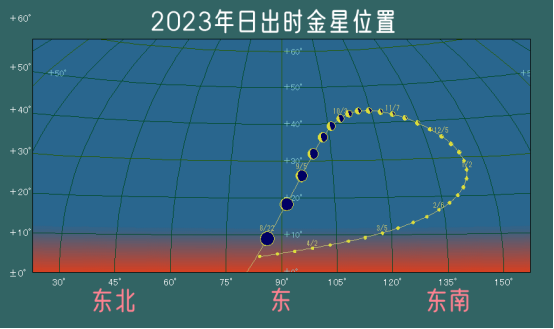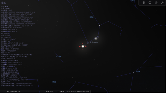 金星西大距的时间为10月24日7时14分,最大离角46.4度、视星等-4.5等。位于狮子座内,日出前可见于东方天空,相当明亮,用天文望远镜可见其呈半月形状。