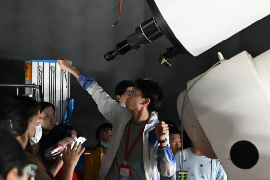 随着参观过程的推进,参观者们跟随讲解员来到天文馆露台观察专业望远镜和观测相关设备的内部构造,并学习观测原理。