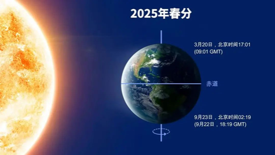 2025年3月20日17:01春分,太阳过天赤道,进入北半球。春分这天太阳光直射点到达黄经0°(春分点)。春分过后,太阳直射点继续由赤道向北半球推移,北半球各地开始昼长夜短,即一天之内白昼开始长于黑夜。春分前后可于日落后1~2小时的西方天空看见黄道光。