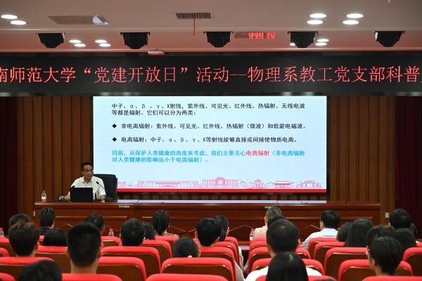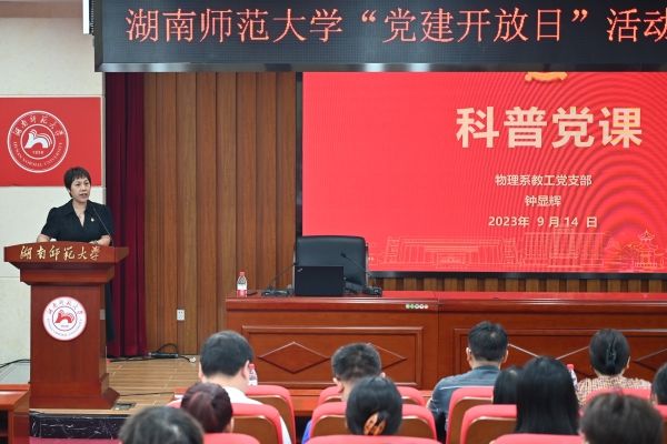 湖南师范大学招生与就业指导处、社科处、组织部、图书馆、工程与设计学院、公共管理学院、历史文化学院、生命科学学院、商学院、数学与统计学院、化工院各支部师生党员代表及物理系教工党支部全体党员参加此次科普党课。