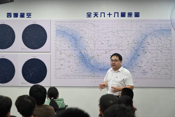 房熊俊带领党员们参观湖南师范大学天文馆,并介绍了馆内展厅相关天文科普内容和天文馆日常建设与管理。他由基本的天文知识切入,结合图片与模型,由浅入深地讲述了恒星、黑洞、宇宙的组成与演化历史等前沿天文学知识。同时,他向党员们介绍了我国的航天发展历程,并分享了中国天眼(FAST)和祝融号登录火星等最新的科研成果和发现。随着讲解过程的进行,党员们跟随房熊俊来到天文馆露台并通过亲身体验专业望远镜和观测相关设备,了解湖南师范大学天文馆的最新观测成果,感受科学之美。