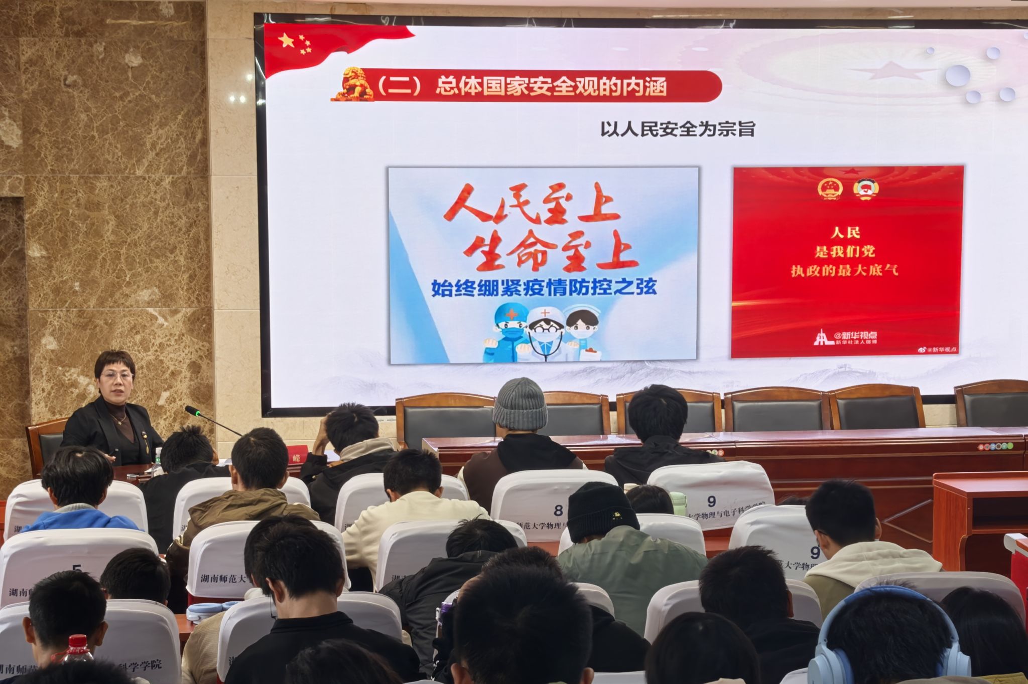 (通讯员 刘子佳 谭烨茜)11月20日下午,物理与电子科学学院党委书记罗嵘于格物楼509报告厅为2024级本科生讲授《形势与政策》课程,课程主题为“全面深入贯彻落实总体国家安全观”,2024级辅导员戴文纯担任主持人。
