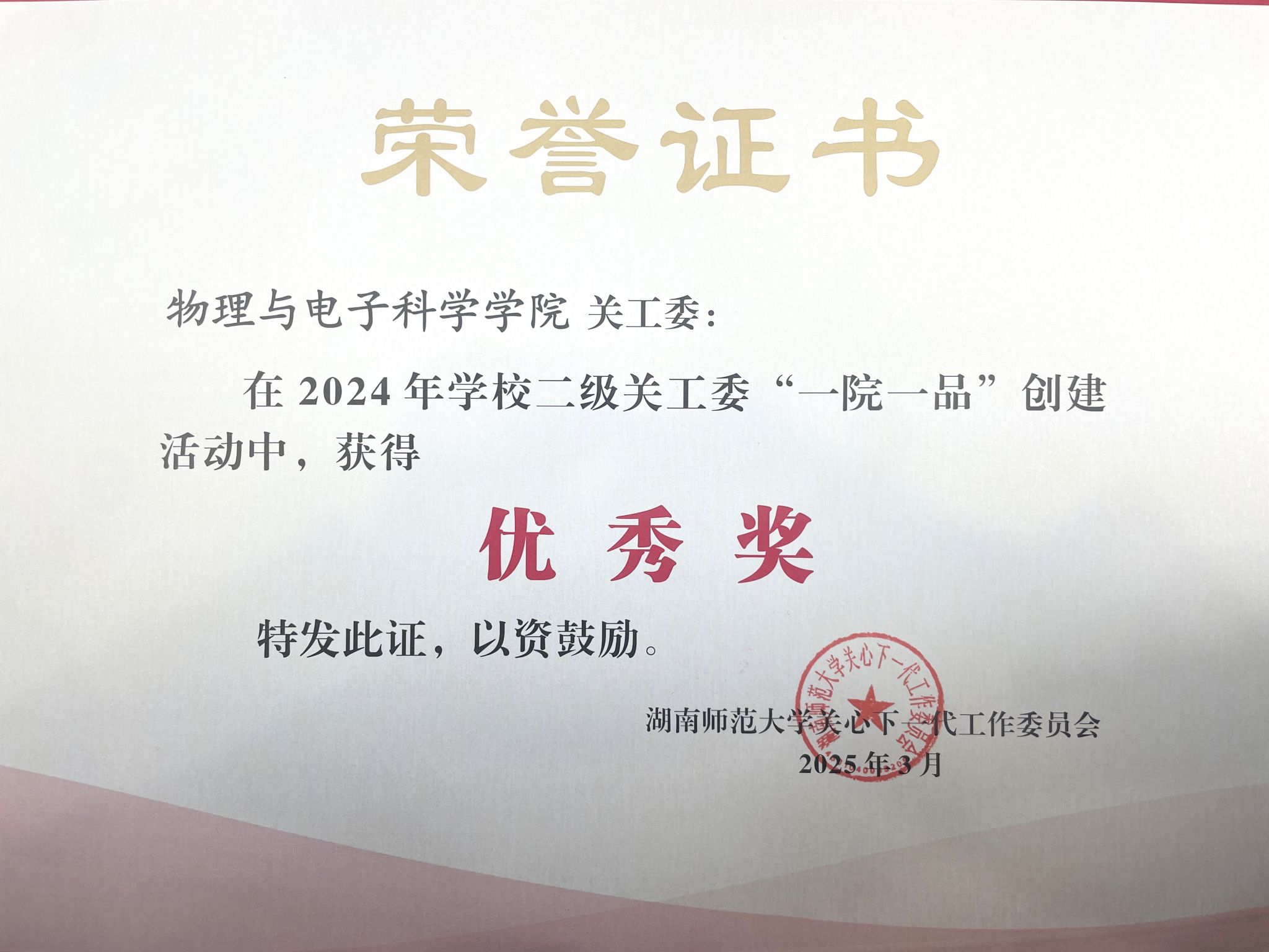 (通讯员 罗瑞霞)3月25日,湖南师范大学关工委于地理科学学院301报告厅召开2025年工作会议。物电院关工委荣获学校第一批“五好“基层关工委,“读懂中国”主题教育活动优秀组织单位,“一院一品”优秀项目单位,物电院关工委为包揽三大奖项的两家单位之一。院长刘红荣、党委书记罗嵘被评为“关工委工作积极支持者”,党委副书记郭铭伟、关工委常务副主任唐咸林被评为“关工委工作先进个人”。