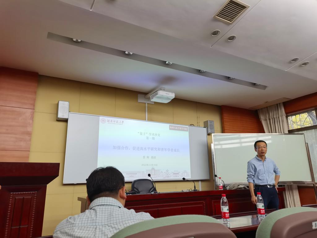 2022年11月10日下午16:00,“量子”学术沙龙第一期活动在量子楼410报告厅举行,报告由景辉教授主讲,廖洁桥副院长主持,学院40余名教师和部分学生参加会议。