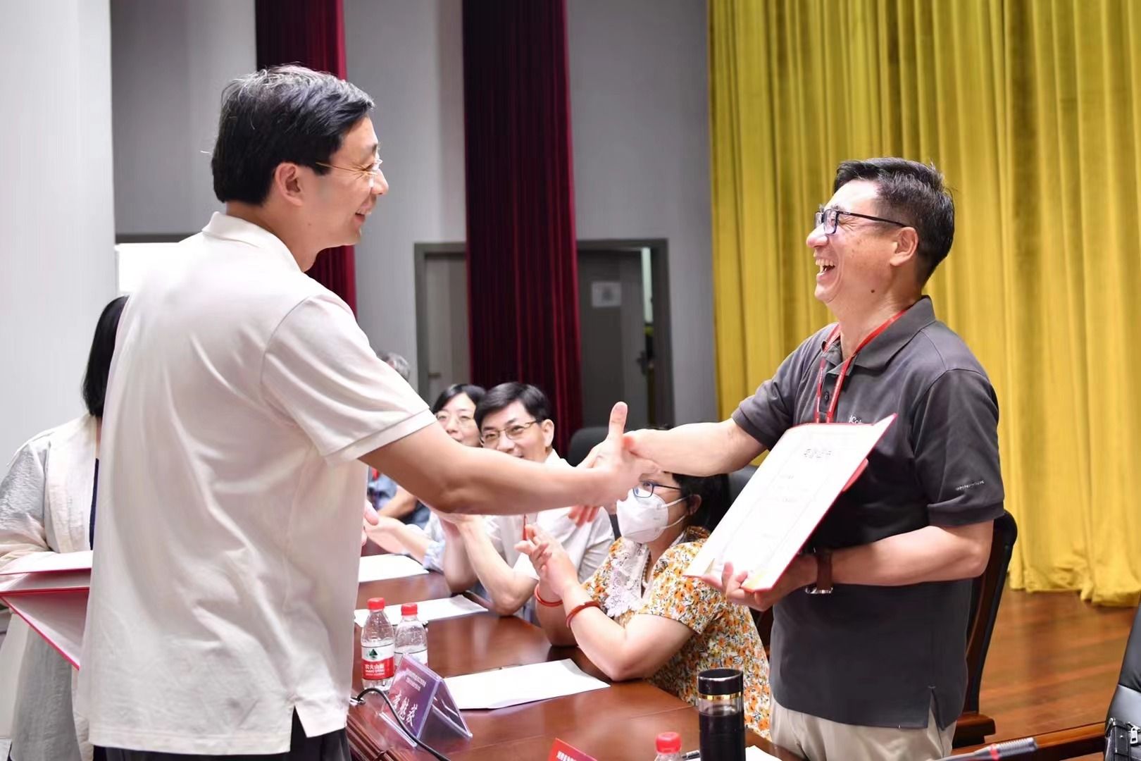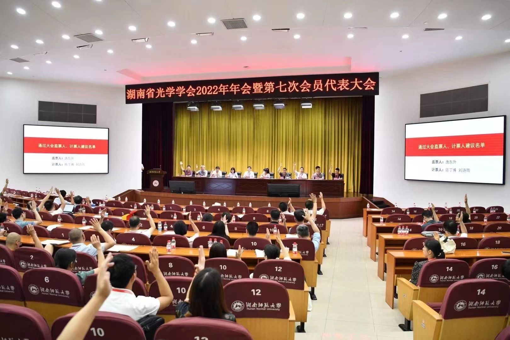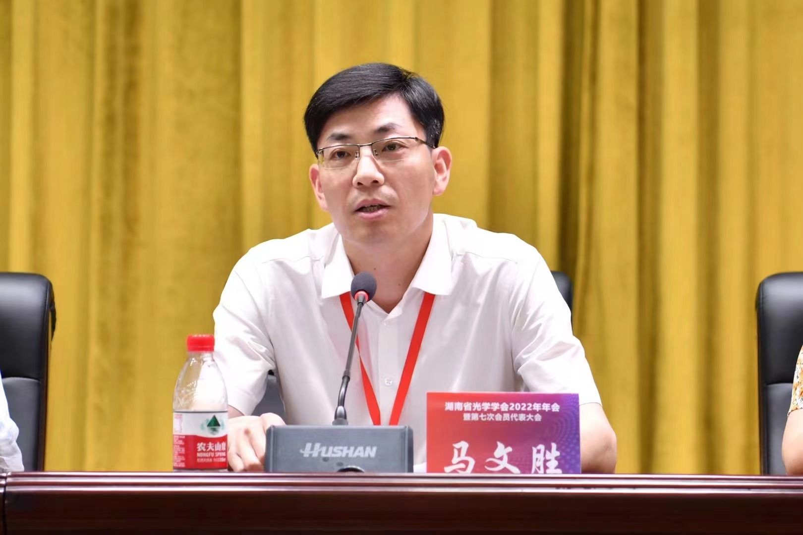 湖南省光学学会理事长、国防科学技术大学教授秦石乔在致辞中充分肯定我校物理与电子科学学院的建设与学科发展,同时对会务组精心的组织及志愿者细致周到的服务表示感谢!大会期间首先开展湖南省光学科技进展奖评选活动,并为获奖者颁发荣誉证书。然后召开第七次会员代表大会,听取审议第六届理事会工作报告和第六届理事会财务工作报告,通报了2018-2022年财务审计报告,通过了大会选举办法(草案),审议表决《湖南省光学学会章程(草案)》。最后换届选举产生了以国防科学技术大学罗晖教授为理事长的新一届理事会,我校物理与电子科学学院副院长廖洁桥教授新增为湖南省光学学会副理事长。湖南省科学技术协会党组成员、办公室主任马文胜,湖南省科学技术协会科学技术创新部副部长朱静颖和湖南省民政厅社会组织管理局科长李魅荻莅临指导。马文胜主任代表湖南省科协向大会的胜利召开表示热烈的祝贺!向全省光学专业领域的科技工作者致以诚挚的问候!李魅荻科长对学会上一届理事会的工作给予了充分肯定,希望新一届理事会再接再厉,祝愿学会发展蒸蒸日上!