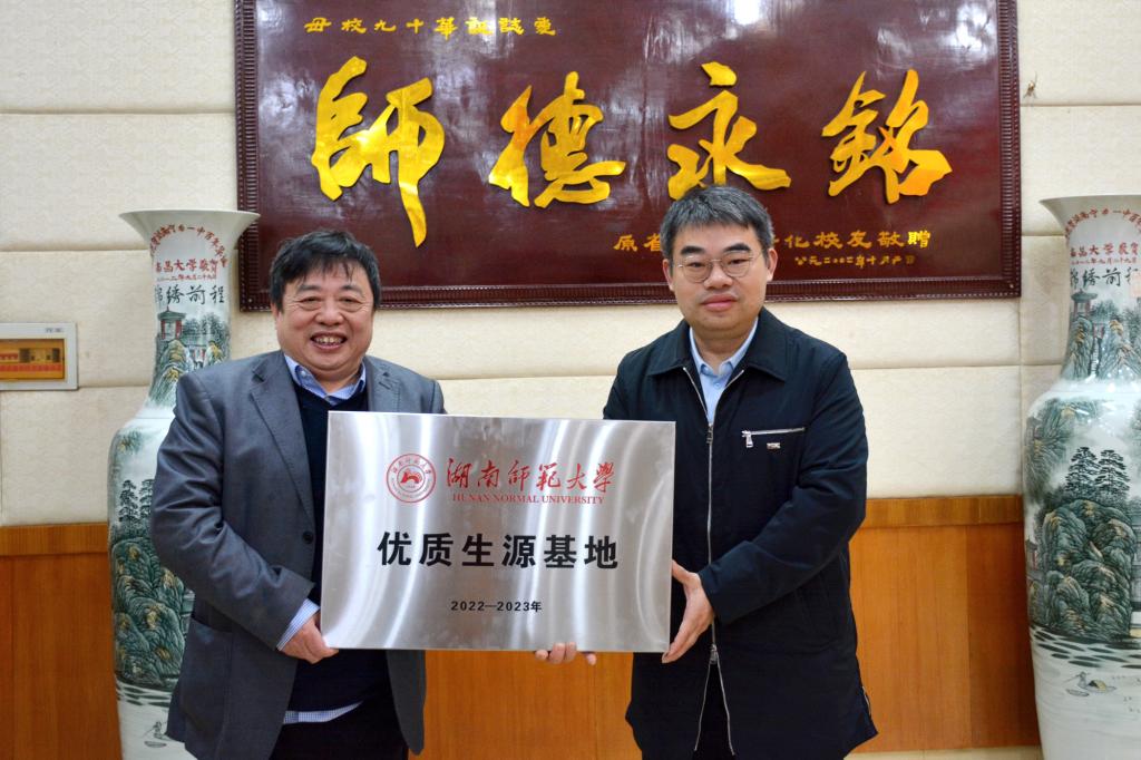 授牌仪式上,田野代表我校对宁乡一中的关心和支持表示感谢,介绍了我校人才培养、学科建设、办学成果等基本情况,希望未来两校能开展更紧密的合作交流,让更多的宁乡一中学生了解师大,来师大深造,携手为国家培育更多创新人才。戴晓成对我校一行表示热烈的欢迎和诚挚的感谢,并介绍了宁乡一中的基本概况、办学特色、办学成绩,表示将以此次活动为契机,为师大输送更多优质生源。最后,田野处长代表我校为宁乡一中授“湖南师范大学优质生源基地”牌匾,宁乡一中校长欧阳才接牌。