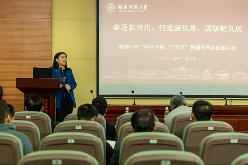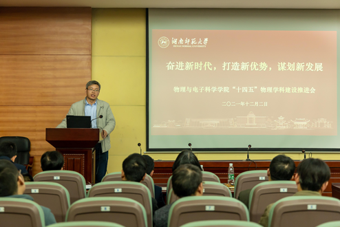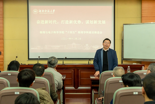 12月2日下午,物理与电子科学学院在量子楼410报告厅召开“十四五”物理学科建设发展推进会。校纪委书记姚春梅,发展规划与学科建设处处长孙岳兵,人事处处长鲁良,科技处处长马铭、副处长邹永星及全体学院领导、重点实验室领导、物理系主任、学科学术骨干等共计50人出席会议。会议由湖南师范大学原副校长、教育部重点实验室主任、物理学科带头人匡乐满主持。他首先阐述了新时代我校物理学科发展所面临的难得的历史机遇和严峻挑战,指出如何抓住机遇、克服挑战是我校物理人迫切需要认真思考和回答的重要问题。大家齐聚一堂召开“十四五”物理学科建设推进会意义也在此。